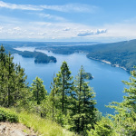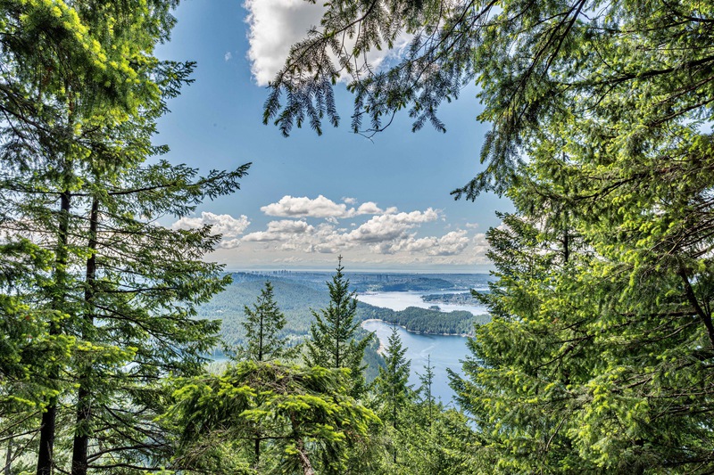 Der Weg schlängelt sich steil mit einer Reihe von Serpentinen durch den Wald. Nachdem wir die Serpentinen passiert haben, werden wir mit einem ersten Blick auf den Sasamat Lake und den Belcarra Regional Park mit Burnaby und Vancouver in der Ferne belohnt. Es geht dann den weniger steilen Hügel hinauf zum zweiten Aussichtspunkt mit Blick auf den Buntzen-Lake und den belebten Strandbereich. Zeit zum Kurzen durchschnaufen.