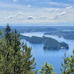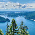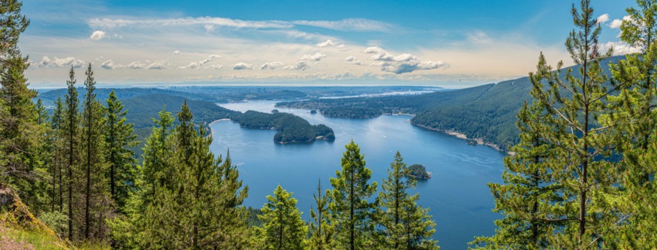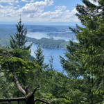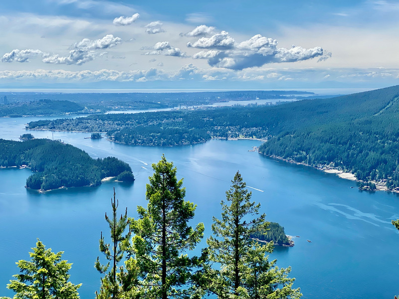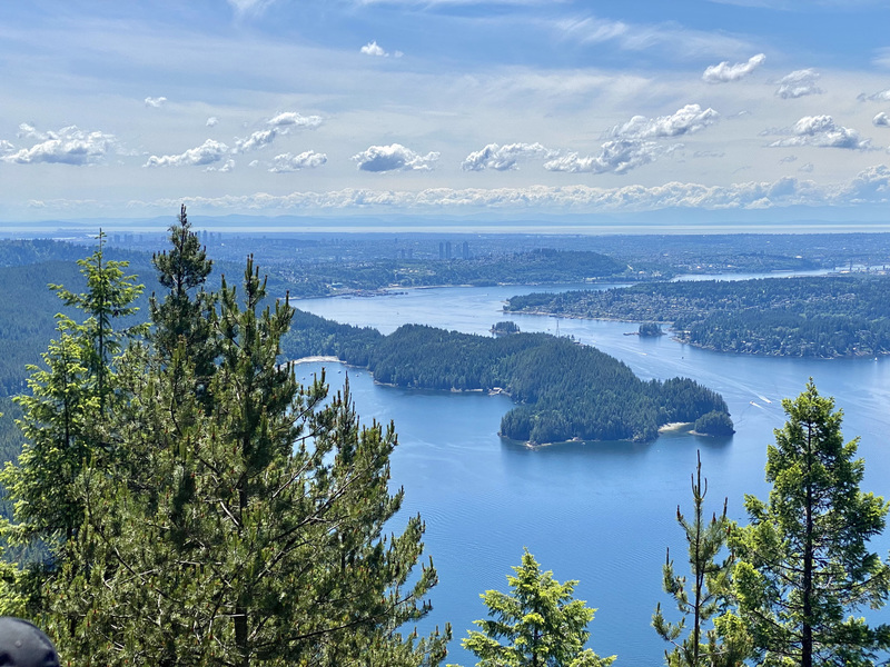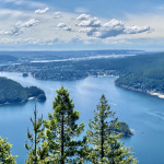 Nachdem wir den zweiten Aussichtspunkt hinter uns gelassen haben, geht's weiter auf und ab durch den Wald bis zum dritten Aussichtspunkt. Dies ist mit Abstand die schönste Aussicht, die einen Großteil des Indian Arm überblickt, mit einer tollen Sicht auf das direkt vor uns liegende Deep Cove uns und die Innenstadt von Vancouver links in der Ferne. Auf der anderen Seite des Indian Arms ragen die Gipfel des Mount Seymour hoch über dem Wasser auf. Hier stärken wird uns erstmal und geniessen den herrlichen Ausblick.