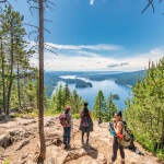 Von diesem Punkt führt der Weg entlang des Kamms mit gelegentlichen Blicken auf Indian Arm und die Häuser entlang der Westseite. Der Trail schlängelt sich noch einige Kilometer durch bewaldete Gebiete und führt allmählich wieder bergab, teilweise ziemlich steil. Nach gut 6 Stunden erreichen wir die Hängebrücke, die zum nördlichen Abschnitt des Buntzen-Lakes zum Strand auf der anderen Seite führt. Hier wird erst einmal etwas gegessen und ein bisschen ausgeruht.